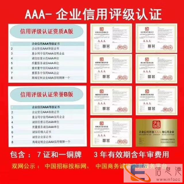 它反映了企业信用度的高低。AAA信用等级是一种等级划分。代指企业的信用经过行业、机构评审达到A级的信用,获评企业会得到机构出具的牌匾、证书。另外,信用等级证书我国采用的是国际通行的“四等十级制”评级等级,具体等级分为:AAA,AA,A,BBB,BB,B,CCC,CC,C,D。其中AAA级是较高等级,D级较低。信用等级越高明企业信用程度越高,经营状况、盈利水平越好,履约能力、偿债能力越强。企业获评AAA信用等级的好处有:1、可快速有效提升企业资质、获得国家政府的认可;并将获得由评级机构颁发的具有统一编号的牌匾和证书。2、是企业履约能力、投标信誉、综合实力与竞争力的体现,在市场活动中不断塑造企业的信用形象。3、可助于银行融资贷款,对于申报政府项目、国家无偿资助时有一定加分。4、允许企业在企业的宣传手册,产品外包装、说明书、合格证等宣传载体上使用的国家商务部信用LOGO;5、企业获得A级以上信用企业的信息在资信评估有限公司的公示平台、中国招标投标网上进行公示,企业和企业上下游客户随时可查询。展开全部,aaa证书属于一种荣誉资质,对企业信用度划分的等级类别,它反映了企业信用度的高低。AAA信用等级是一种等级划分。代指企业的信用经过行业、机构评审达到A级的信用,获评企业会得到机构出具的牌匾、证书。另外,信用等级证书我国采用的是国际通行的“四等十级制”评级等级,具体等级分为:AAA,AA,A,BBB,BB,B,CCC,CC,C,D。其中AAA级是较高等级,D级较低。信用等级越高明企业信用程度越高,经营状况、盈利水平越好,履约能力、偿债能力越强。企业获评AAA信用等级的好处有:1、可快速有效提升企业资质、获得国家政府的认可;并将获得由评级机构颁发的具有统一编号的牌匾和证书。2、是企业履约能力、投标信誉、综合实力与竞争力的体现,在市场活动中不断塑造企业的信用形象。3、可助于银行融资贷款,对于申报政府项目、国家无偿资助时有一定加分。4、允许企业在企业的宣传手册,产品外包装、说明书、合格证等宣传载体上使用的国家商务部信用LOGO;5、企业获得A级以上信用企业的信息在资信评估有限公司的公示平台、中国招标投标网上进行公示,企业和企业上下游客户随时可查询。展开全部需要找专业的机构来做。我想你说的AAA信用等级应该是专指招投标类的信用评级吧,因为其他评级品种很难达到AAA级别的。若是投标类信用评级,要看公司的业务范围,如果是省内入围,那么建议找省内入围的评级机构;如果是全国多省市投标,建议找全国资质的信用评级机构,如联合、大公、中诚信。我是联合的,若有更多问题,可以咨询我,回答望采纳 如果有更多问题,可以联系我,我会给您满意的答复申报:一、初步预审:二、填报审批;三、初审通过填写《企业信用等级评价申报书》、签订协议书2份;四、机构审核;五、证书备案、发证备案完成,颁发认证证书、信用报告及相关荣誉证书等,中国招标投标网站能查